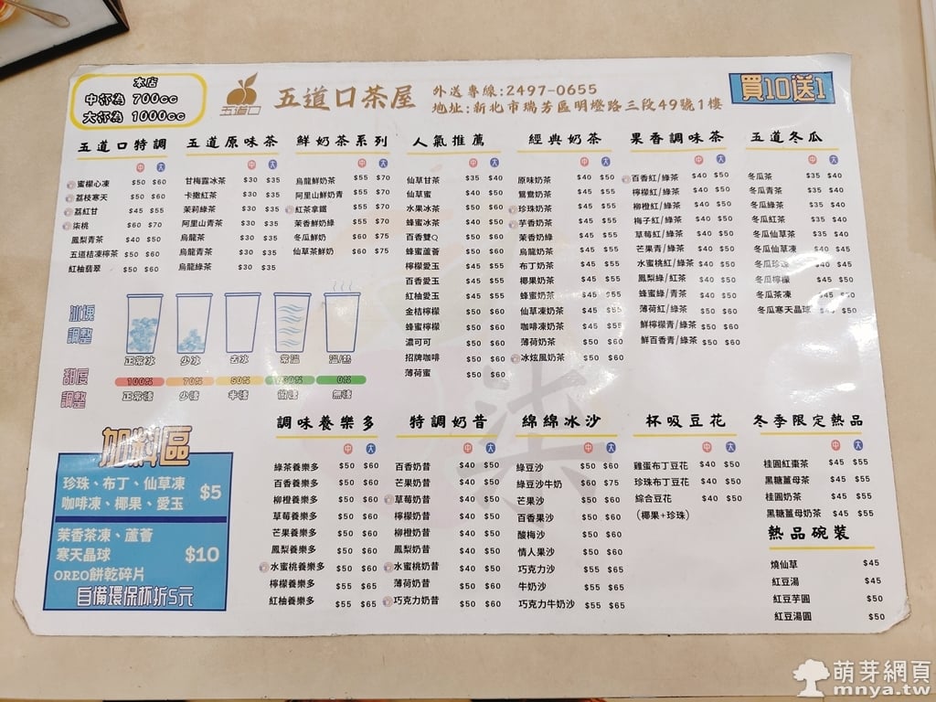 「五道口茶屋」位在明燈路三段49號,靠近瑞芳火車站。店家提供特調、原味茶、鮮奶茶、人氣推薦、經典奶茶、果香調味茶、冬瓜、養樂多、特調奶昔、綿綿冰沙、杯吸豆花、冬季限定熱品等系列飲品,為一家手搖飲料店。提供冰量(正常冰、少冰、去冰、常溫、溫/熱)及糖量(正常糖、少糖、半糖、微糖、無糖)調整,可加料(+5 元有珍珠、布丁、仙草凍、咖啡凍、椰果、愛玉/+10 元有茉香茶凍、蘆薈、寒天晶球、OREO餅乾碎片)。外帶為主。先付款 💸,可用現金或 TWQR,無發票 🧾。現點現做,等候時間依照現場狀況而定。
