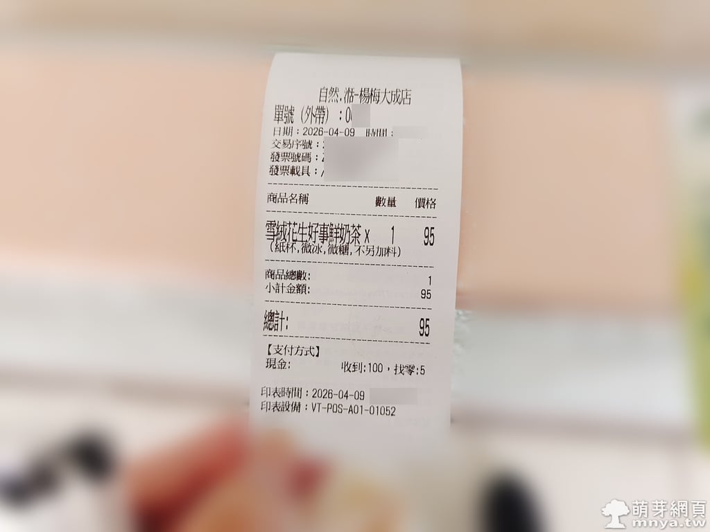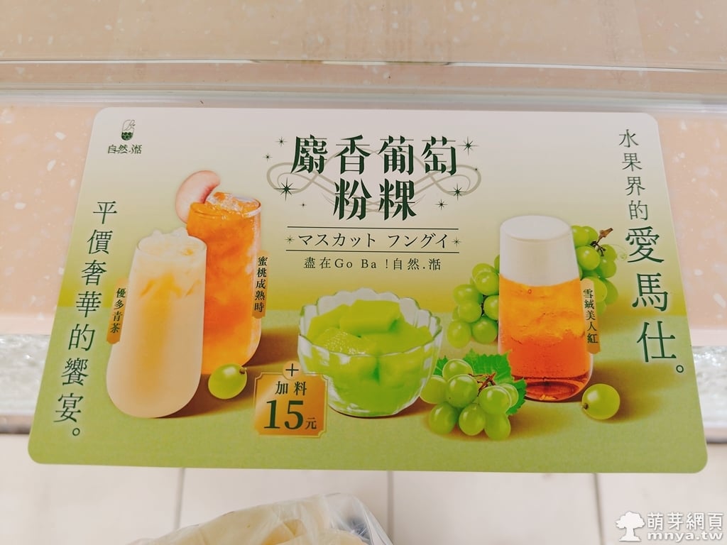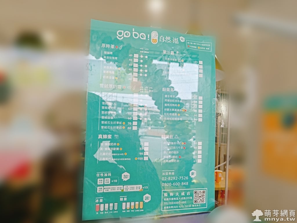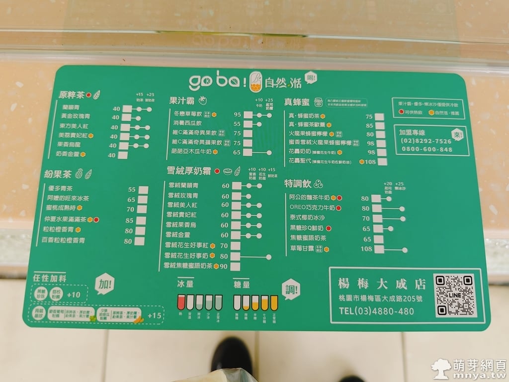 「Go ba 自然湉(楊梅大成店)」位在大成路205號,靠近楊梅火車站,今年(2026 年)4 月 3 日新開幕 ✨,為該品牌在桃園市的第一家門市。店家提供原粹茶、紛果茶、果汁霸、雪絨厚奶霜、真蜂蜜和特調飲等系列飲品,為一家連鎖手搖飲料店。提供冰量(正常冰、少冰、微冰、常溫、熱)及糖量(正常糖、七分糖、半糖、微糖、無糖)調整,可加料(+10 元有黑糖珍珠、荔枝粉粿/+15 元有蒟蒻晶球、麝香葡萄粉粿、夕張哈密瓜粉粿)。外帶為主。先付款 💸,目前僅能用現金支付,發票可存載具 🧾。現點現做,等候時間依照現場狀況而定。